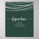 Diese rustikale Saite leuchtet grüne Hochzeit Open Bar poster ist perfekt für eine klassische Hochzeit. Das Design zeichnet sich durch schöne handbemalte Saitenleuchten in einem grünen Hintergrund aus.