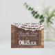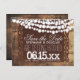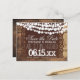 Rustikales Land Save the Date Postkarten mit einem Hintergrund aus rustikalem Holz und Vintagem braunem Papier mit leuchtenden Lichterketten oben. Diese Hochzeitsausweise Save the Date haben Platz auf der Rückseite für Ihre Rücksendeadresse und einen leeren Platz für Sie, um die Postkarten an Ihre Gäste zu richten. Diese sind ideal für Hochzeiten auf dem Lande und für Stallhochzeiten. Matching-Set-Elemente: