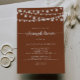 Diese rustikale Saitenbeleuchtung Terracotta Probe Dinner Einladung ist perfekt für eine einfache Veranstaltung. Das Design besticht durch schöne handbemalte Saitenleuchten in Terrakotta-Hintergrund.