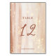 Diese Hochzeitskalligraphie-Tischnummer ist mit einem eleganten Hintergrund aus Braun und Gold, der der rustikalen Terrakotta-Farbkalligraphie-Schrift entspricht, ausgestattet.