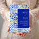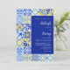 Dieses rustikale Design zeichnet sich durch ein Muster von blauen, weißen und gelben portugiesischen Fliesen im Hintergrund aus. Personalisieren Sie sie mit den Namen der Braut und des Bräutigams in marineblauer Kalligraphie-Skript und dem verbleibenden Text in einer Kombination aus Sans Serif, Copperplate und Kursivschrift auf einem weißen Rechteck, das mit dem rechten Rand der Karte ausgerichtet ist. Auf der Rückseite wird ein passendes Fliesenmuster angezeigt.