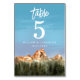 Rustikale Hochzeitssemble mit Tischnummer eines roten Berges mit Kiefernwald. Ideal für eine Herbst- oder Winterhochzeit.