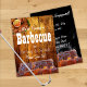 Rustikaler Holzfußboden mit Fotos von Hühnerflügel in der oberen links Ecke und Grillrippen unten vorne. Beinhaltet anpassbaren Text auf Vorder- und Rückseite der Karte - Vorlagen sind richtig. Die Rückseite hat einen glatten, dunklen Hintergrund mit Foto von Grillrippen aus Schweinefleisch am Boden.