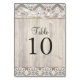 Rustikale Vintage Spitzen- und Holzhochzeitungs-Ti Tischnummer
