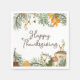 Rustikale Servietten zum Erntedank mit einigen botanischen Arrangements mit wilden Blume, Pilzen, Pinienbäumen Blätter, Herbstlauben und einer lebhaften Biene. Custom Happy Thanksgiving Typografie.