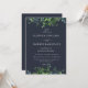 Rustikale Aquarellgrände mit grünen und blauen Wäldern, Einladung zur Hochzeit. Die Karte zeichnet sich durch elegantes und modernes weißes Typografie-Design mit marineblau-farbenem Hintergrund aus.
