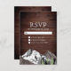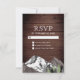 Elegante rustikale Hochzeitskarte RSVP mit schönen schneebedeckten Bergen und Pinienbäumen mit moderner Typografie vor einem Stallholzhintergrund.
