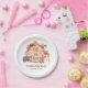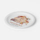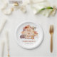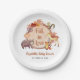 Rustikale Teller mit Herbst-Babydusche mit einem Kranz aus Baumstamm, niedlichen Wasserfarben von Waldtieren (Hirsch, Eichhörnchen, Bär und Fuchs), Terrakotta-Flora und Kürbis. "Fall in der Liebe" und der Name der Mutter, die sie sein soll, sind in einem verbrannten orangefarbenen Skript geschrieben.