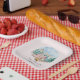 Die Teller der Papierkoordination sind ein Teil der Dekorprodukte des Party, die dieser Einladungspalette entsprechen. Weich weißer Holzboden mit Aquarellbildern aus Bergen, Wäldern und niedlichen Waldtieren mit Blume im Haar und einem staubigen rosa und grauen Zelt auf einem Glanz-, Camping-Ausflug! Der Text der Schriftzeichen-Kalligrafie endet mit dem Entwurf. Malerei von Audrey Jeanne Roberts, international lizenzierter Künstler, Urheberrecht.