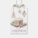 Ein rustikales, modernes, erdfarbenes Weihnachtsgeschenk-Tag mit Weihnachtskerzen, Ornamenten, hängt von einem rustikalen Zweig. Ein hübsches, erdschonendes rustikales Geschenk-Tag.
