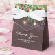 Personalisierte Weihnachtsschachteln mit dunklem Holzboden, festliche Weihnachtsbaumäste, Rot- und Goldbaumdekorationen, Kiefernfüße, Tinkelleuchten, der Titel "Danke" und Ihre Namen.