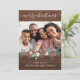 Diese schlichten und festlichen Urlaubskarten sind mit Ihrem persönlichen Foto ausgestattet, mit einer modernen Schriftzeichen-Typografie, die auf einem rustikalen, braunen Holzhintergrund "Frohe Weihnachten" sagt. Es gibt einen hübschen Zweig aus grünem Weihnachtsgrün, traditionelle rot-weiße Blume, Nadelkronen und roten, heiligen Beeren, die klassisch und gleichzeitig modern aussehen.