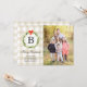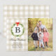 Diese rustikale Weihnachtsfotokarte ist für ein Foto in vertikaler Richtung konzipiert und enthält ein kariertes Büffel in Cremetönen, einen Aquarellkranz und einen kleinen roten Bogen. Die Rückseite der Karte ist ein karierter, cremefarbener und weißer Büffel. © 2021 Tea Olive Co.