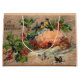 Schöne, gemütliche, rustikale Vignette mit antiker Steinkirche bei Sonnenuntergang gerahmt von schneebedeckten Heiligen, einem glücklichen Weihnachtsgrüßen und mehreren Vögeln auf verwittertem Holzboden.