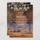 Diese rustikale Western-Scheunenholz-Hochzeitseinladung mit einer Western-Ranch-Gebirgsszene und Lichterketten auf einem Scheunenholz-Hintergrund kann mit Ihren Informationen in stilvoller Typografie personalisiert werden. Mit allen Ihren besonderen Hochzeitstagsinformationen auf der Rückseite, einschließlich Ihres Registrierungs-QR-Codes. Entworfen von Thisisnotme