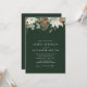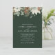 Rustikale Winter Blume Aquarell Hochzeit Einladung. Blume, Eukalyptus, Kiefernzapfen und Kiefernäste auf dem waldgrünen Hintergrund. Passen Sie dieses Design mit Ihren persönlichen Informationen und Ihren Initialen auf der Rückseite an.