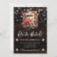 Wunderschöne Rustikale Wintermühle mit Roter Poinsettia und Beeren auf dunkelbraunem Holzboden mit Schneeflocken und Diamanten