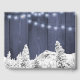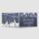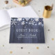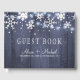 Rustikales, landschaftliches personalisiertes Gästebuch mit weißen Schneeflocken, einer Berglandschaft (hinten) und blinkenden Hängeleuchten auf dunkelblauem grauem Holzboden. Ideal für den Winter | elegantes rustikales Land | Wunderland thematisierte Hochzeit.