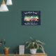 Niedliche rustikale Babydusche-Begrüßungsschild mit einer Darstellung von Waldtieren mit ihrem Zelt-Camping unter einem dunkelblauen Sternenhimmel in den Bergen und Wäldern, und "Adventure Awaits" und der Name der Mutter, die zu sein hat, in einem weißen Drehbuch.