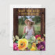 Rustikaler dunkelbrauner Abschluss Save the Date/Announcement-Postkarte mit bunten Gelb- und lila Aquarellblumen und Platz für Ihr Foto. Kontaktieren Sie uns für Hilfe bei der Anpassung oder um passende Produkte anzufordern.