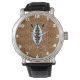 Diese Uhr zeigt einen Afrikanischen Schild und gekreuzte Speere auf einem simulierten Holzhintergrund mit einem Stammesmuster. Große, unverwechselbare Handverschleiß für jeden Anlass!