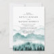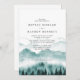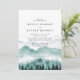 Elegante und rustikale Hochzeitseinladung mit Aquarellberg mit Bäumen und Bräuten und Bräuchen Initialen im Hintergrund mit Hochzeitsdetails.