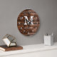 Mit Monogramm Wanduhr mit dunkelbraunem Holzhintergrund. Personalisieren Sie die Uhr für die Familie mit Ihrem Familiennamen und dem Anfangsbuchstaben für Monogramm.