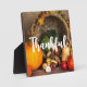 Eine Foto-Plakette mit Foto einer Erntedank-Ernte, Set auf einem rustikalen Holztisch. Kürbis, Kartoffeln, Squash usw... bilden diese reiche Sammlung von Lebensmitteln. Farbige Herbstblätter umschließen den Kornukokia-Korb.