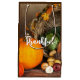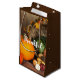 Eine Geschenktasche mit Foto einer Erntedank Ernte, Set auf einem rustikalen Holztisch. Kürbis, Kartoffeln, Squash usw... bilden diese reiche Sammlung von Lebensmitteln. Farbige Herbstblätter umschließen den Kornukokia-Korb.
