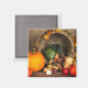 Ein Magnet mit einem Foto einer Erntedank Ernte, Set auf einem rustikalen Holztisch. Kürbis, Kartoffeln, Squash usw... bilden diese reiche Sammlung von Lebensmitteln. Farbige Herbstblätter umschließen den Kornukokia-Korb.