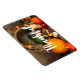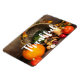 Magnet mit einem Foto von einer Erntedank Ernte, Set auf einem rustikalen Holztisch. Kürbis, Kartoffeln, Squash usw... bilden diese reiche Sammlung von Lebensmitteln. Farbige Herbstblätter umschließen den Kornukokia-Korb.
