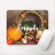 Mousepad mit Foto einer Erntedank Ernte, Set auf einem rustikalen Holztisch. Kürbis, Kartoffeln, Squash usw... bilden diese reiche Sammlung von Lebensmitteln. Farbige Herbstblätter umschließen den Kornukokia-Korb.