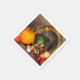Papierservietten mit Foto einer Erntedank-Ernte, Set auf einem rustikalen Holztisch. Kürbis, Kartoffeln, Squash usw... bilden diese reiche Sammlung von Lebensmitteln. Farbige Herbstblätter umschließen den Kornukokia-Korb.
