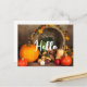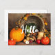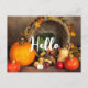 Hallo Postkarte mit einem Foto von einer Erntedank Ernte, Set auf einem rustikalen Holztisch. Kürbis, Kartoffeln, Squash usw... bilden diese reiche Sammlung von Lebensmitteln. Farbige Herbstblätter umschließen den Kornukokia-Korb.