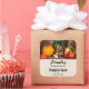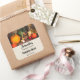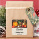 Candle-, Seife- oder Küchenproduktkleber mit Foto einer Erntedank-Ernte, Set auf einem rustikalen Holztisch. Kürbis, Kartoffeln, Squash usw... bilden diese reiche Sammlung von Lebensmitteln. Farbige Herbstblätter umschließen den Kornukokia-Korb.