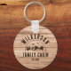 Moderne rustikale Schlüsselkette mit einem trendigen Wald-Gebirgsdesign mit Kiefern, Wäldern und Vögeln, umgeben von Ihrem eigenen Familiennamen auf bedrucktem Holzpaneelhintergrund, einem personalisierbaren Namen Ihrer Hütte, Kabine, Seehaus usw., sowie dem etablierten Jahr.