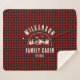 Rustikale, moderne Sherpa-Decke mit einem trendigen Wald-Gebirge-Design mit Kiefern, Wäldern und Vögeln umgeben von Ihrem eigenen Familiennamen auf bedrucktem, rotem Büffel kariertem Hintergrund, einem personalisierbaren Namen Ihrer Hütte, Kabine, Seehaus oder anderen, sowie das Jahr, das festgelegt wurde.