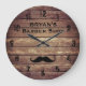 Barber Shop Große Uhr mit Schnurrbart-Bild und personalisiertem Firmennamen auf einem rustikalen Holzhintergrund.