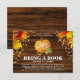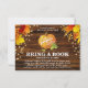 Ein niedlicher rustikaler Herbstfall 'Bringen Sie ein Buch' Umzäunungskarte mit einem dunklen Holzboden, einem glänzenden Kürbis, Herbst verlass und Imitat Gold Glitzer Confetti. Die perfekte Art, um die Gäste fragen, ein Buch anstelle einer Karte zu Ihrer Babydusche zu bringen.