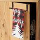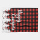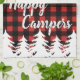 Rustikaler Büffel-Karo kariert im roten und schwarzen Küchentuch, welches die Phrase "glückliche Camper" und weiße Bäume kennzeichnet.