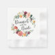 Der Hochzeitsbrunch mit den Bride-Servietten ist mit einem stylischen, dunkelgrauen Schriftzeichen gerahmt, der von einem wunderschönen rustikalen Kranz von Sommer- und Herbstfarben mit Rose, Dahlien, peonischen Blume und Grünpflanzen in einer herrlichen Herbstpalette aus bordeauxroten, goldgelben, pfirsichfarbenen, rot rosa und grün und grün.