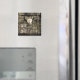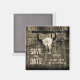 Rustikaler Western Hochzeitskuhschädel mit Hörnern Vintagen Stil Ankündigung Datum freihalten quadratischen Kühlschrankmagnet. Ranch Grunge Textur. Der Cowboy aus Stallholz inspirierte. Die antike sepia braune Bison feine Kunst.