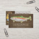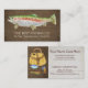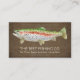 Rustikales, dunkel verwittertes, gefärbtes Holzfischen Guide Lake Charter Boat Business Card Design. Der dunkle Holzboden ist ein schönes Set von der elegant handgemalten Regenbogenforelle, dem Fischkreel und den Köchen. Für rustikale Outdoor Wildnis, Bergsee oder Flussfischerei Geschäfte wie Führer, Angelläden, Köderläden und Bootsverleih. Dieses Kunstwerk wurde von Audrey Jeanne Roberts, einem international lizenzierten Künstler und Produktdesigner, erstellt.