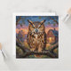 Eine leere Karte, um in Kontakt zu bleiben oder jemandem eine Nachricht zu schreiben, mit einem auffallenden Uhu, der in einem reichen, dicken Impasto-Ölmalstil dargestellt ist. Die lebendigen Texturen und der warme Sonnenuntergangshintergrund schaffen eine gemütliche, rustikale Atmosphäre, die perfekt für Naturliebhaber und Kunstliebhaber ist.