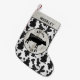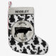 Rustikale Bauernhäuser sehen Weihnachtsfeierliche Strumpf mit einer Kuh-Silhouette auf Holzkorn, mit einem weißen und schwarzen gepunkteten Kuhboden. Fügen Sie Ihren Namen oben mit der Vorlage ein. Ideal für Fans des Vintagen Bauernstils und für Rinder-Bauer.
