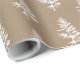 Kraft Weihnachtspapier für die Feiertage mit einem weißen Fichtenbaum in einem Wiederholmuster auf kraftstofffarbenem Wickelpapier.