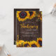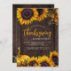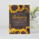 Rustikales, modernes, orangefarbenes botanisches Rahmenwerk mit Sonnenblumen, Herbstlauben und Kürbis-Erntedank / Freundliches Dinner Party Einladung mit schicker goldener Schrift auf dunkelbraunem Holzboden. +++++ Geeignet für ein elegantes rustikales Erntedank Party.