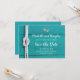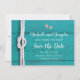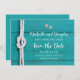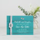 Rustikale Karte zum Thema Wassersport. Der Hintergrund hat eine türkisfarbene oder aquamarine Holzstruktur. Ein nautischer Knoten spielt auf niedliche Weise mit den Worten "den Knoten binden". Zwei kleine Herzenssymbole fügen eine schöne Touch hinzu. Dieses Design ist trendig und unisex. Ideal für eine Hochzeit zum Thema Wassersport, eine Hochzeit am Strand oder eine Hochzeit in Urlaubsort. Ideal für Bootsliebhaber und Segler.