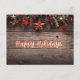 Feierliches und rustikales Design mit einem Top-Weihnachtsgartenrahmen, dunklem Holzhintergrund und "Happy Holidays" im Neontext. Fügen Sie Ihre personalisierte Nachricht zurück. Geeignet sowohl für geschäftliche als auch für private Zwecke
