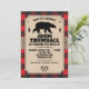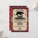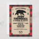 Ein Hintergrund der karierten Kontraste des roten Büffels gegen eine Packpapier-Blickplatte hielt an durch einen Leinwandbügel auf dieser Northwoods themed Einladung. Die Platte verwahrt die Partyinformationen, die einen Bären zwischen zwei Kiefernbäumen kennzeichnen. Die gekreuzte Axt macht ein kundenspezifisches Logo unten. Groß für einen Geburtstag, ein Junggeselle-Party, ein Saisonereignis oder ein Büffel kariert oder themed Feier des Holzfällers. Verfügbar mit zusammenpassenden Produkten.